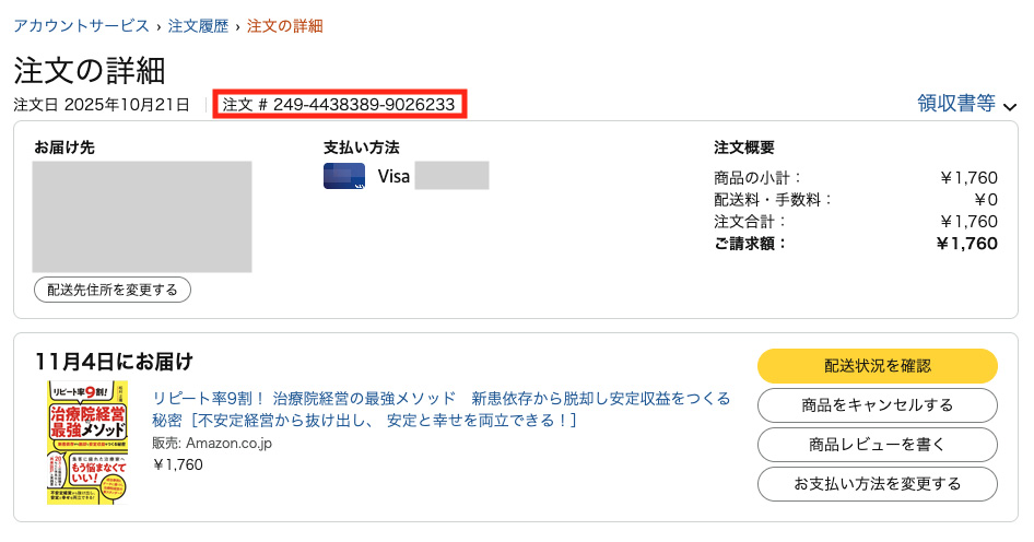 購入後、Amazon購入履歴から注文番号をコピーしてください。