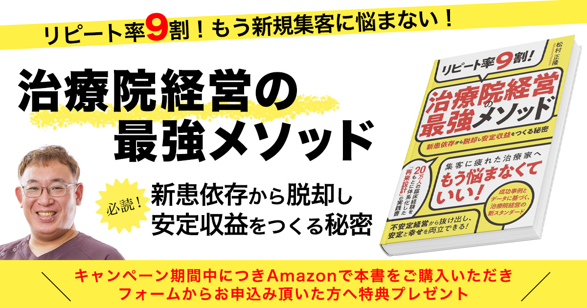 キャンペーン期間中に新刊『新患依存から脱却し、安定収益をつくる秘密』をAmazonから購入予約していただき、フォームからお申し込みいただいた人に特典をプレゼントさせていただきます。